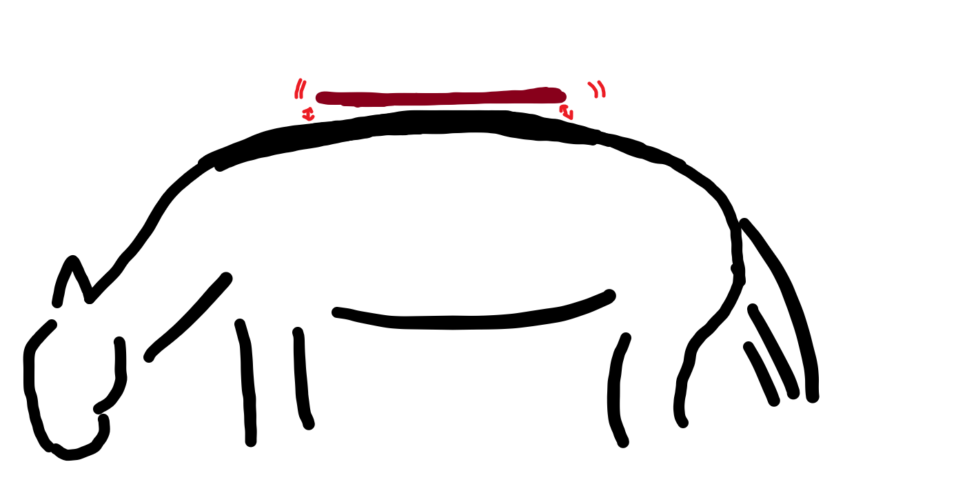 Das Pferd soll ja Vorwärts-Abwärts laufen, den Brustkorb anheben und den Rücken wölben. Prima wenn es das macht und prima ist auch, dass in der Stellung der Sattel dann nach vorne und hinten kippt und so das Pferd aus dem Gleichgewicht bringt. Bzw. fällt der Sattel nach vorne, drückt er auch vorne. Lege ich das Gewicht nach hinten, ist der Sattel wieder hinter dem Schwerpunkt. Auch nicht viel besser. Die Zeichnung zeigt – hoffe ich – deutlich das Problem.